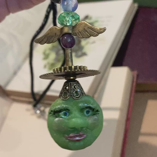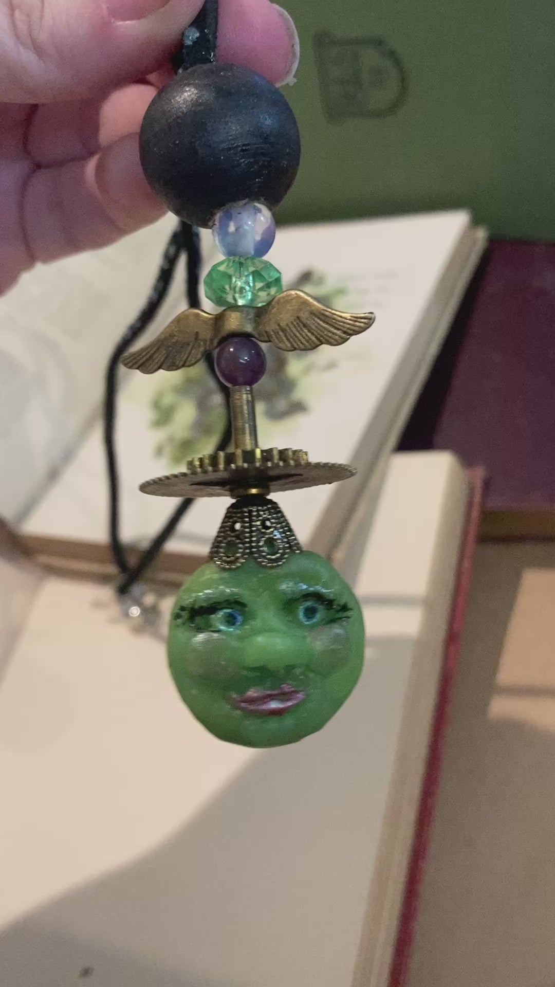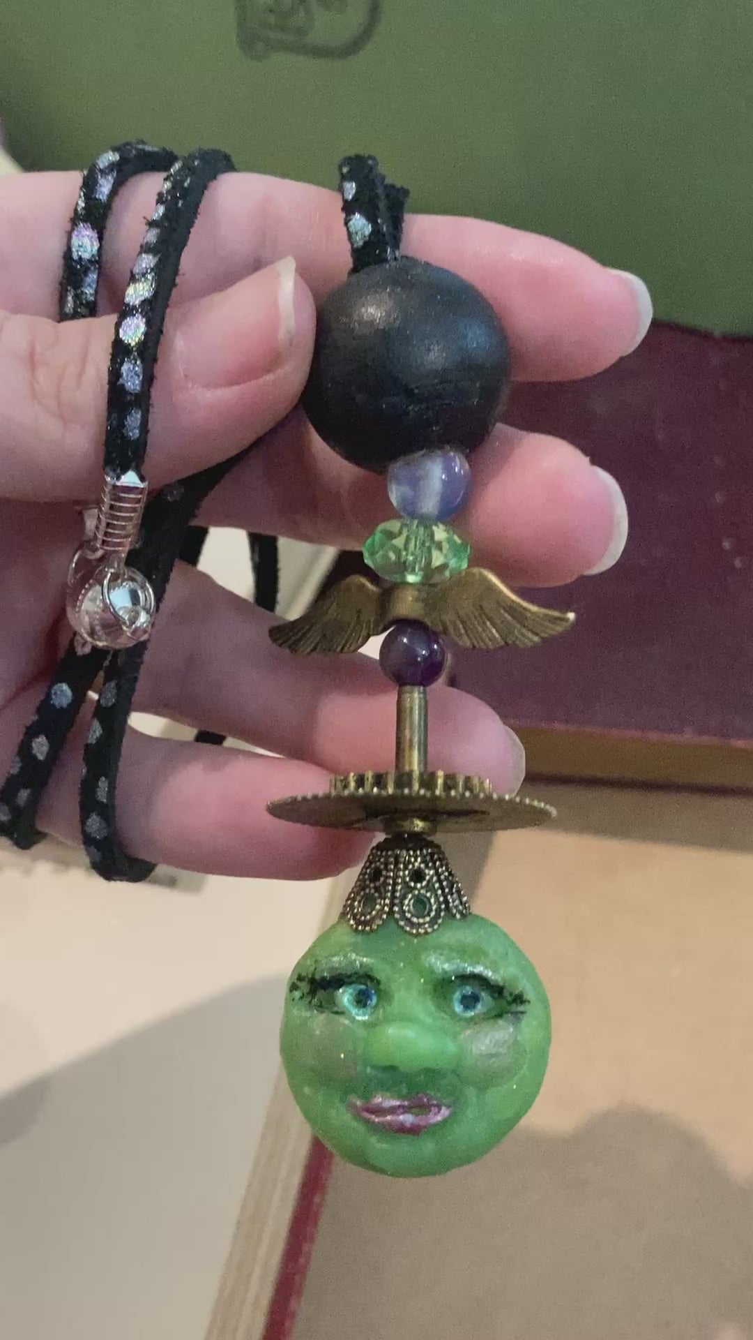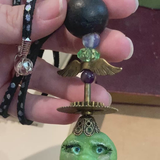 Gretel the Green Witch stresses over nothing and wants to share that calm, grounding energy with you. Just look at that peaceful smile! I made this necklace with several moveable parts to use as a convenient fidget toy. You can spin the real antique clock gears above the friendly green witch’s face or twirl the metal wings and glass and stone beads. The cord is made of embellished black leather with a sturdy magnetic clasp (who doesn’t love fiddling with small magnets?)