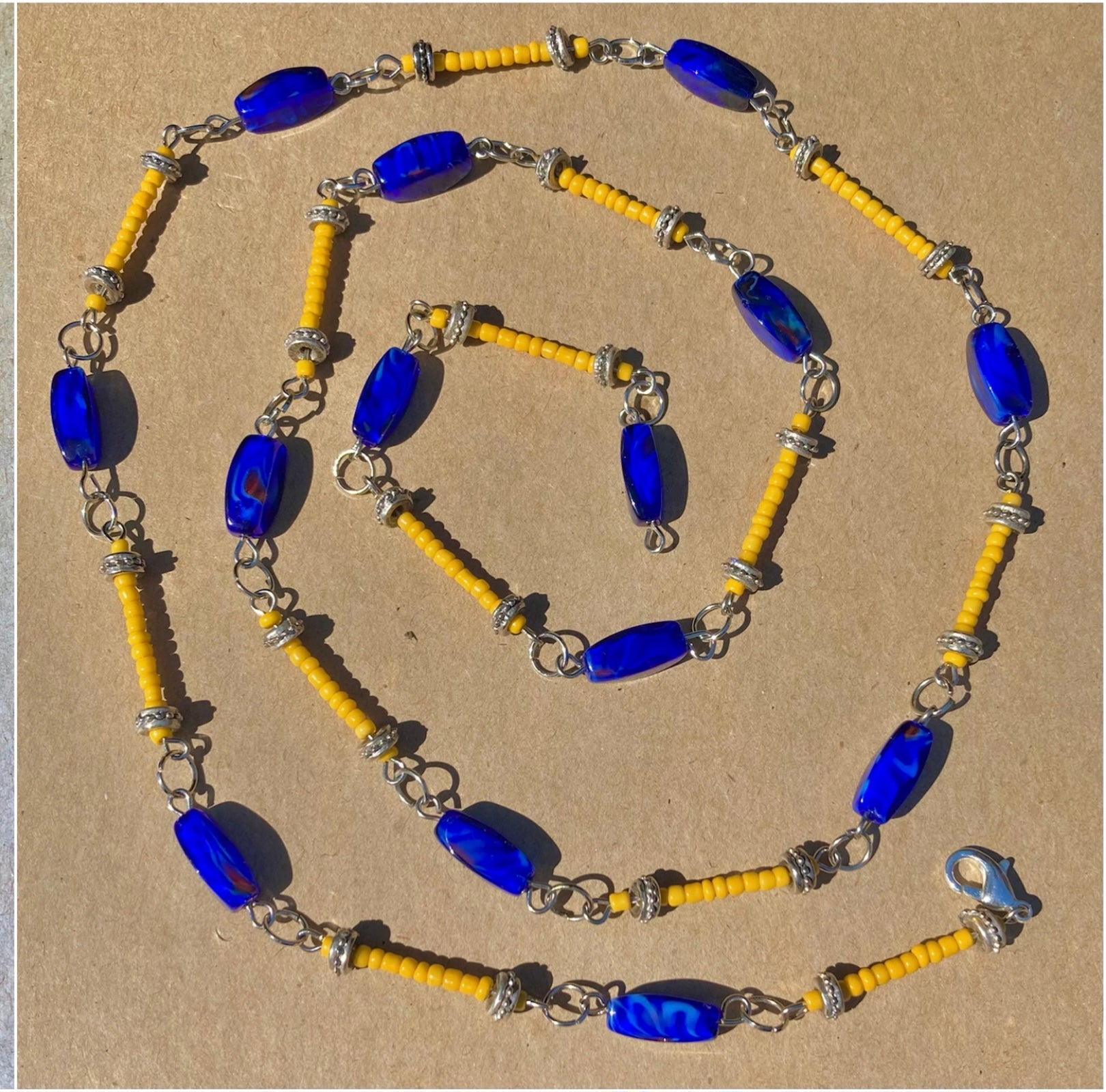 I Originally made this beaded necklace to wear in support of the Ukrainian people. It is also the colors of my Alma Maters - Madonna University and Schoolcraft College - and the University of Michigan.