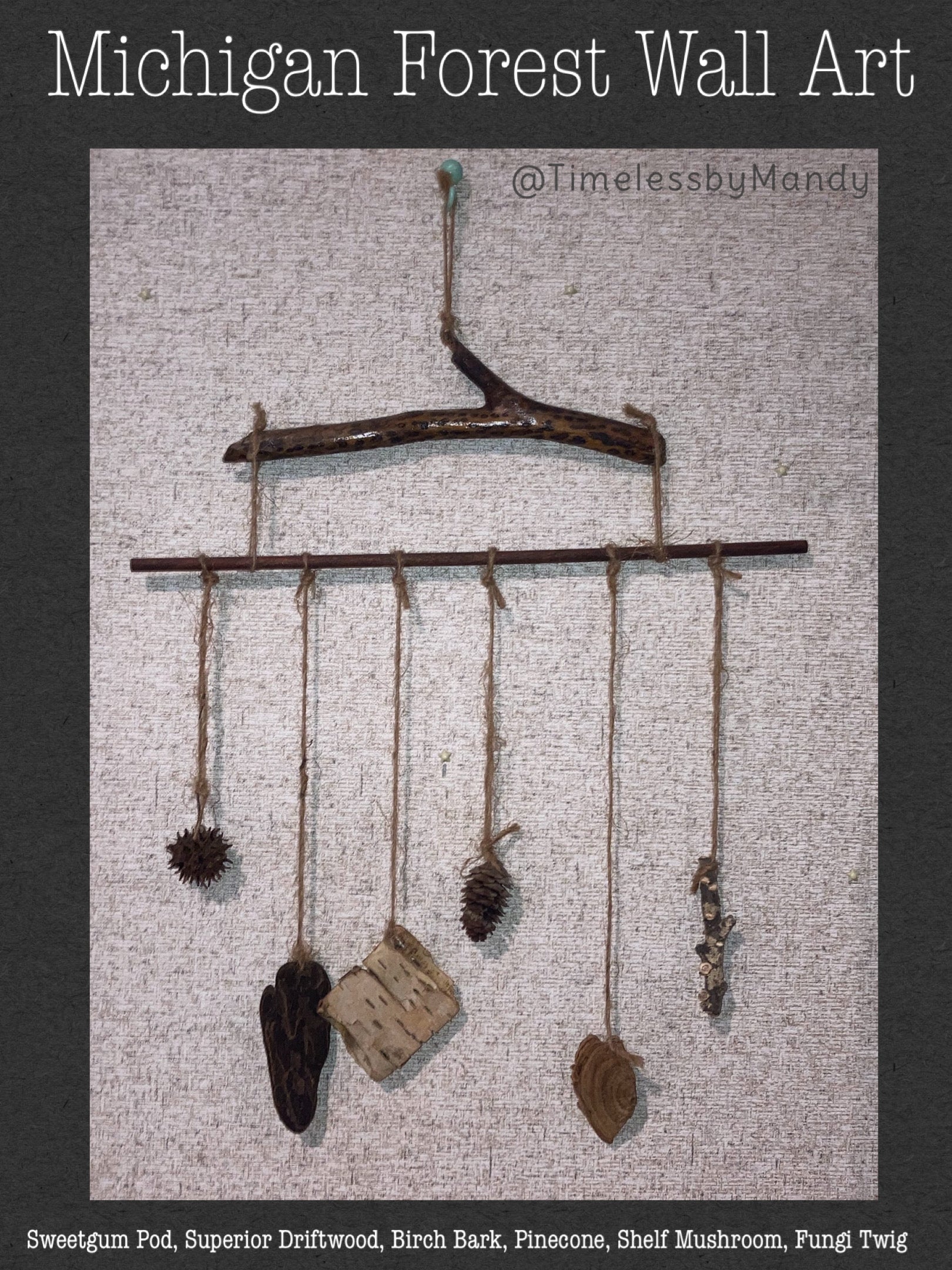Michigan Forest Treasures Wall Art Hanging Mobile with Nature Specimens of Sweetgum Pine Birch Fungi